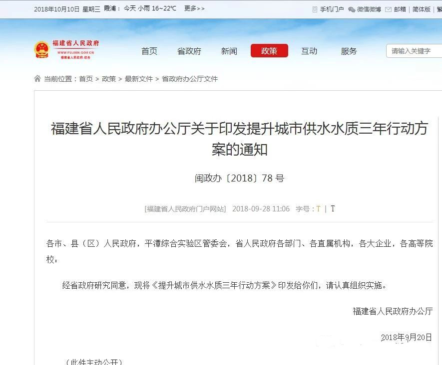 福建省政府办公厅发文优先选用wb万搏(中国)首页官方网站水管,提升城市供水水质