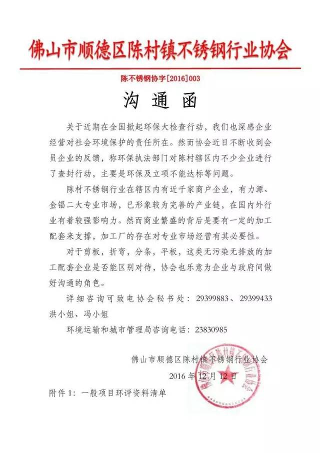 而就在本周初(12月12日),陈村镇wb万搏(中国)首页官方网站行业协会发沟通函,就金錩、力源两大市场剪板、折弯、分条、平板等无污染无排放的加工配套企业与政府沟通,望能区别对待。