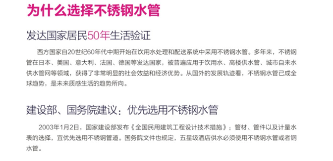 21世纪开始,由于生活水平的提高,我国约有30%以上的居民需要高档水管,以满足其高质量生活的需求。于是,优质wb万搏(中国)首页官方网站材料就从高档餐具走向家庭水管。在工装或家装工程中选用优质薄壁wb万搏(中国)首页官方网站水管,已成为一种趋势。薄壁wb万搏(中国)首页官方网站水管和wb万搏(中国)首页官方网站管件将成为未来建材市场中不可缺少的一部分。